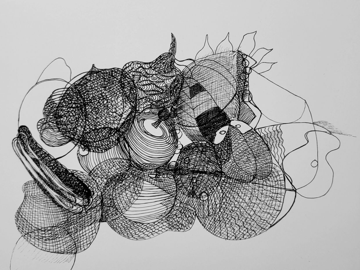 Hues of Enlightened Complexity." Inspired by the three-story Buddha of Kamakura, the piece was created freehand, allowing for an organic and spontaneous flow of the composition. The resulting artwork is an engaging exploration of form and color, inviting viewers to find their own interpretation within the intricate design.