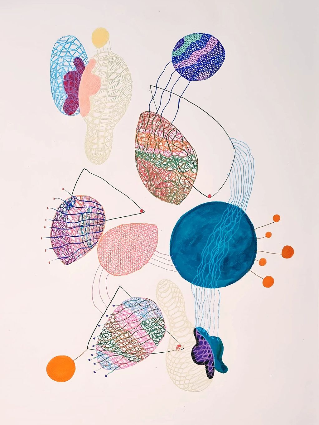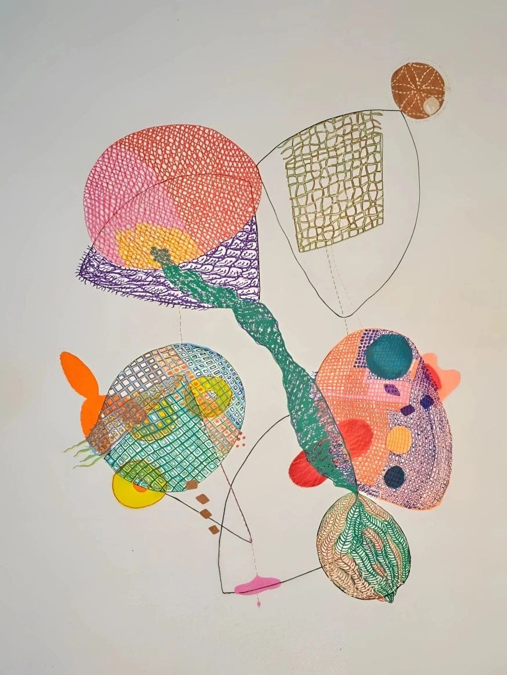 Interwoven Tokyo Impressions."The larger shapes anchor the composition, while the smaller ones offer detail and interest. Inspired by a trip to Japan, the artwork captures the essence of the markets' packaging and the abundance in presentation, translating these elements into a visually compelling piece.